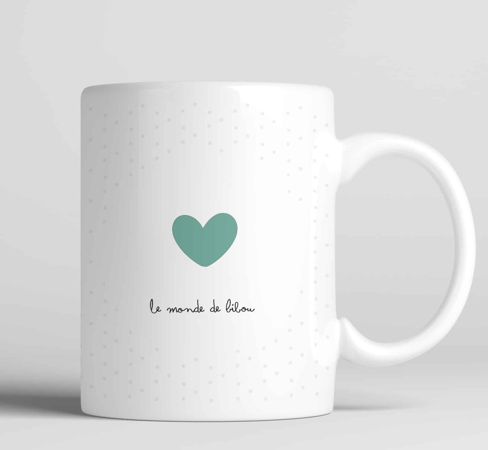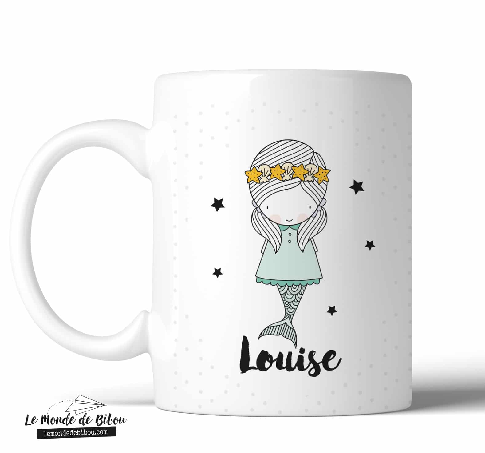 L’illustration de la petite fille avec sa couronne de coquillages est réalisée avec couleurs douces et discrètes (jaune or et vert minth) plaira à coup sûr à l’enfant qui recevra ce mug. Le fond de la tasse est de couleur blanche avec des petits pois gris