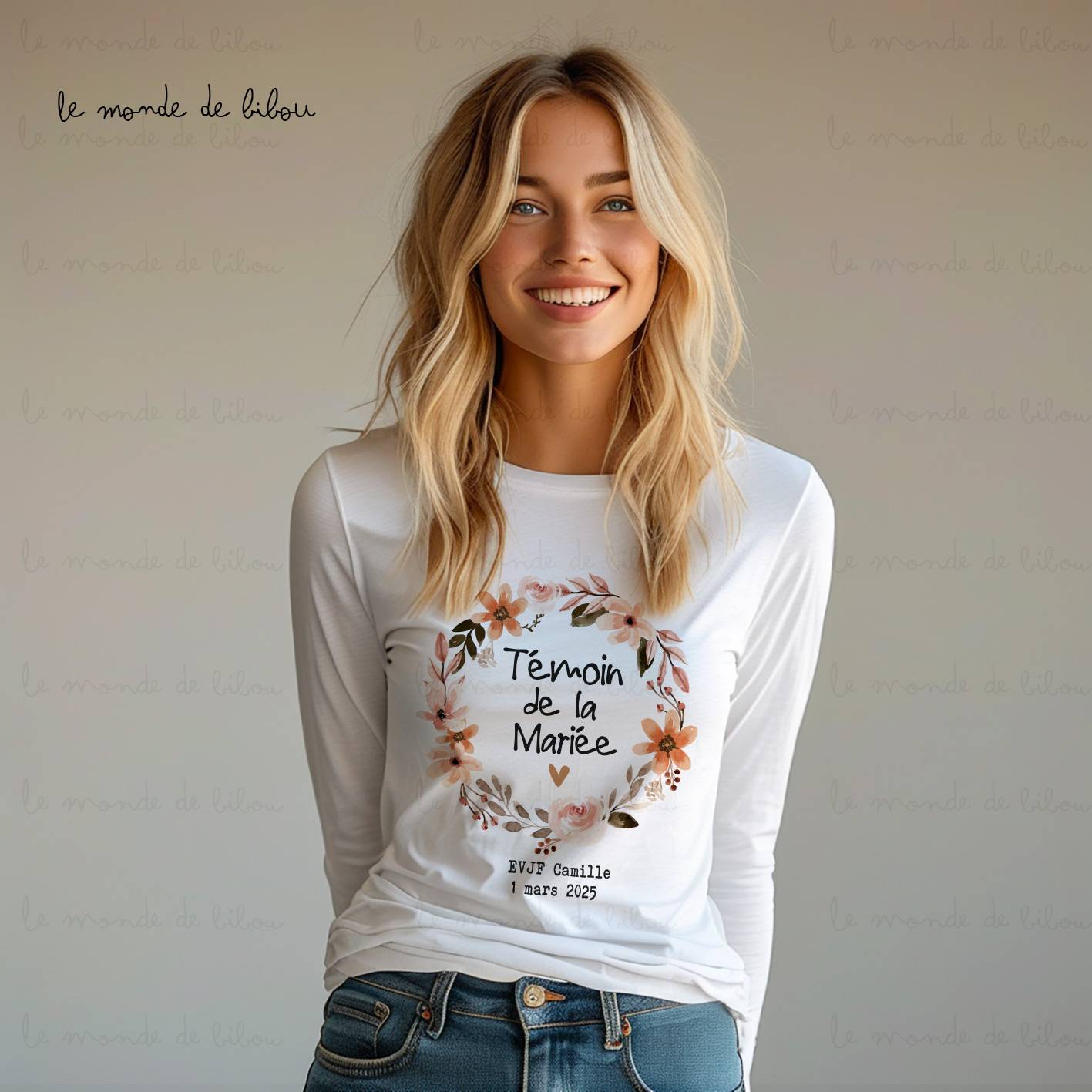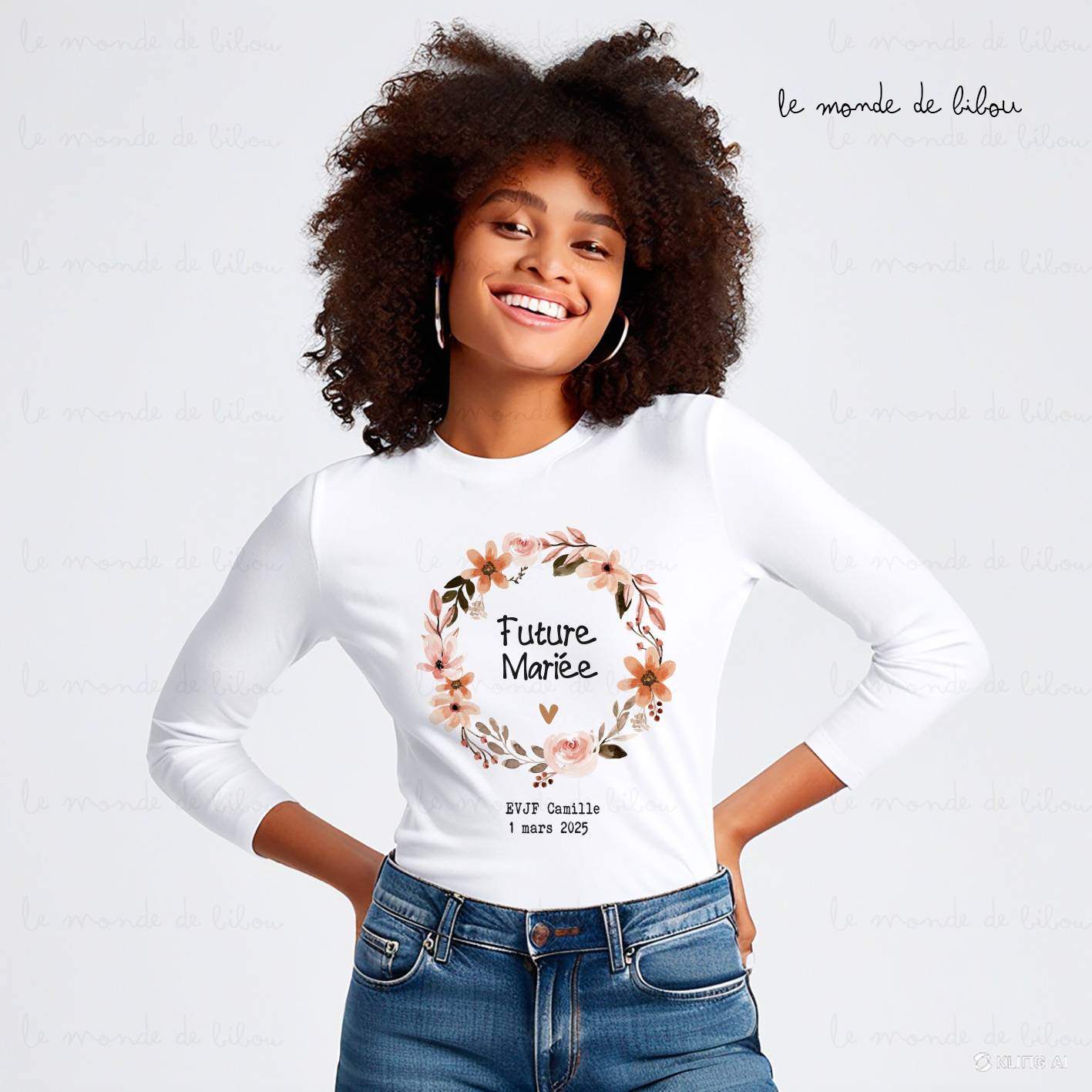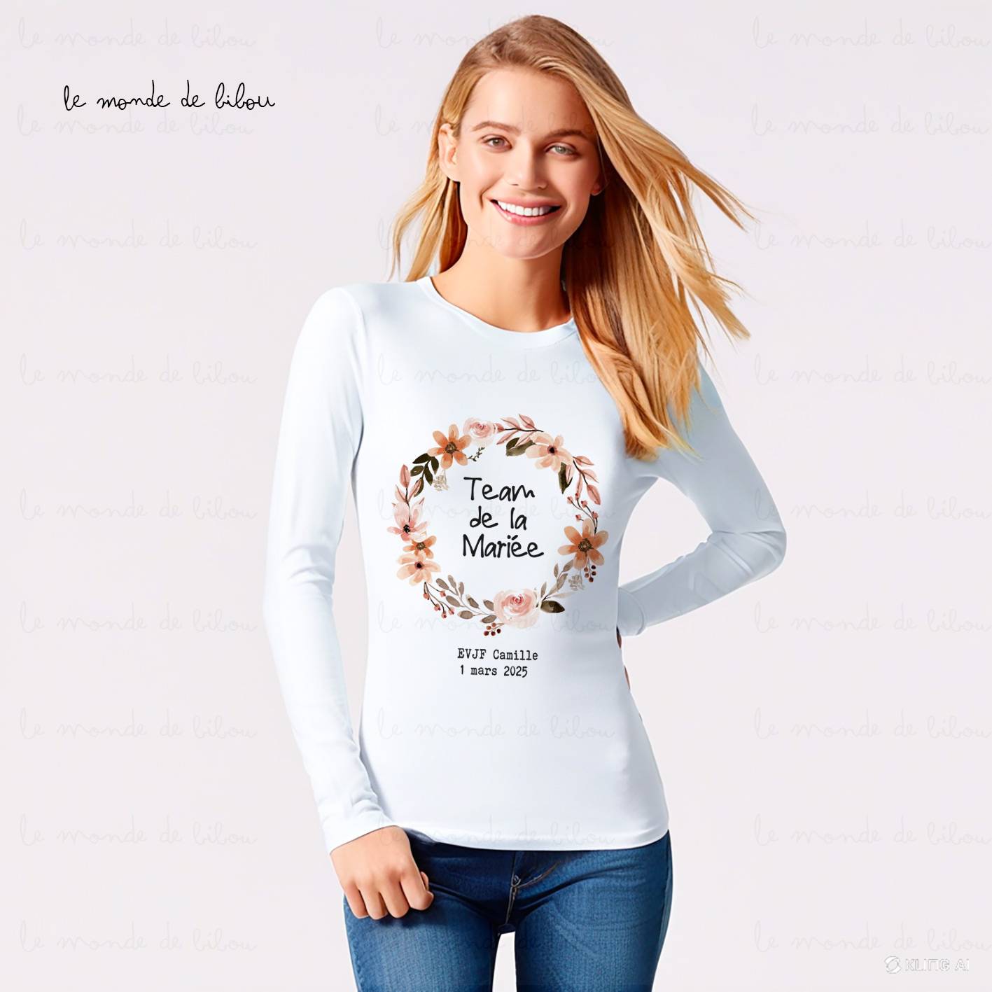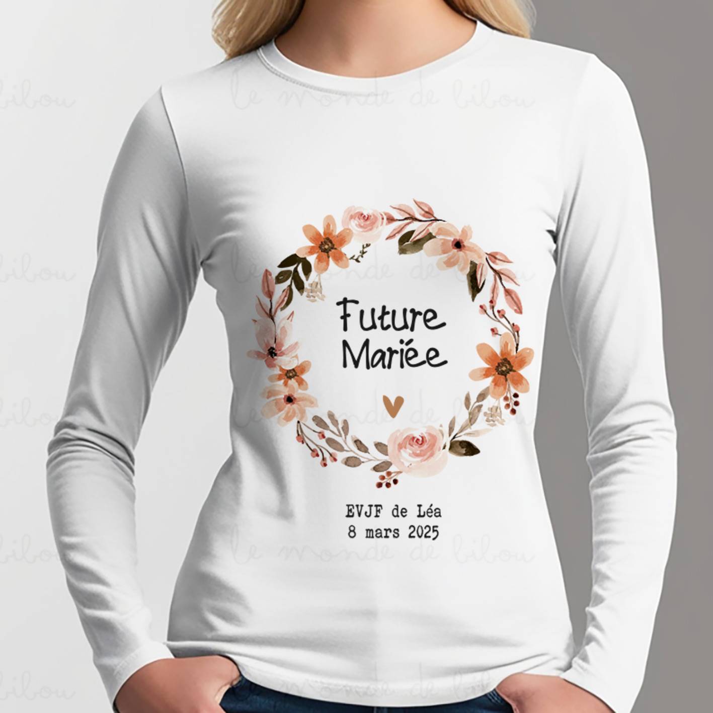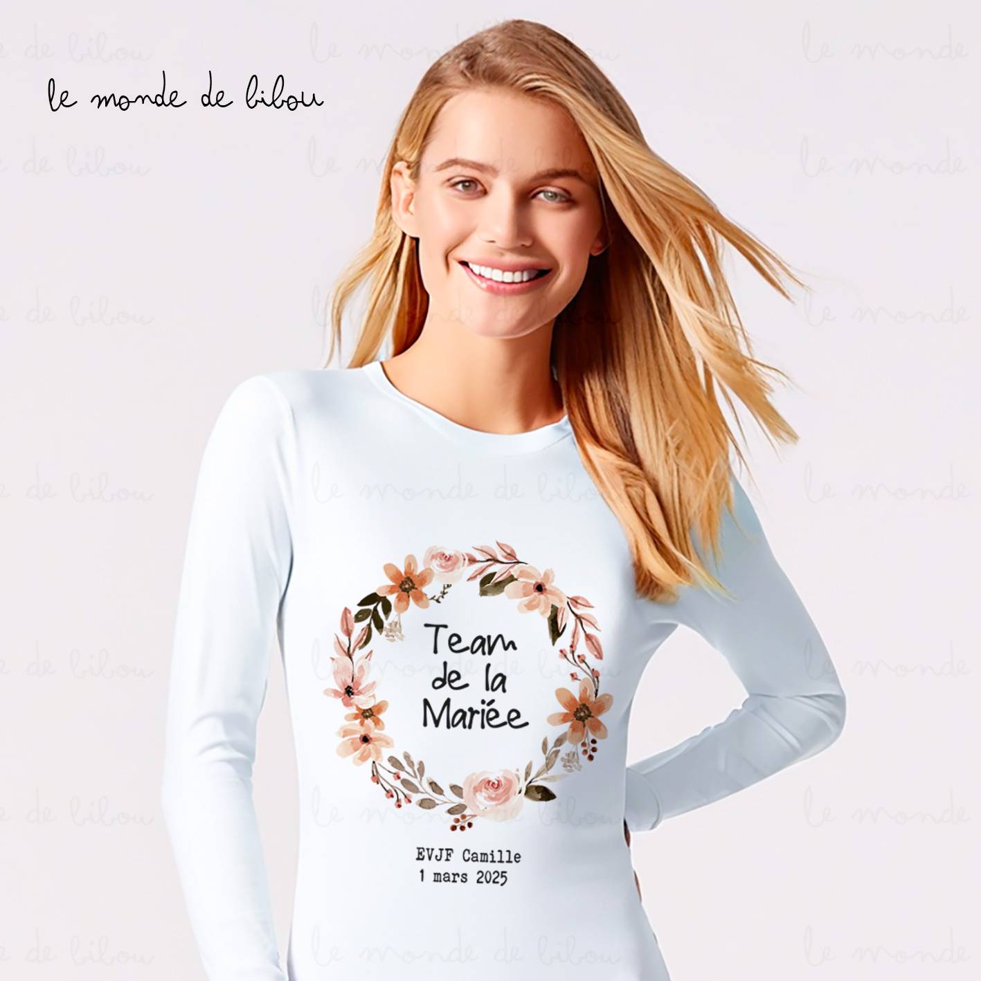 Parfait pour un EVJF hivernal, notre modèle « Couronne de fleurs » combine style et confort tout en gardant l’équipe assortie. Ces T-shirts personnalisables sont idéaux pour créer une ambiance chaleureuse et marquer cette journée spéciale autour de la future mariée. Grâce à leur design élégant et leur personnalisation adaptée, ils deviendront un souvenir inoubliable pour toute l’équipe.