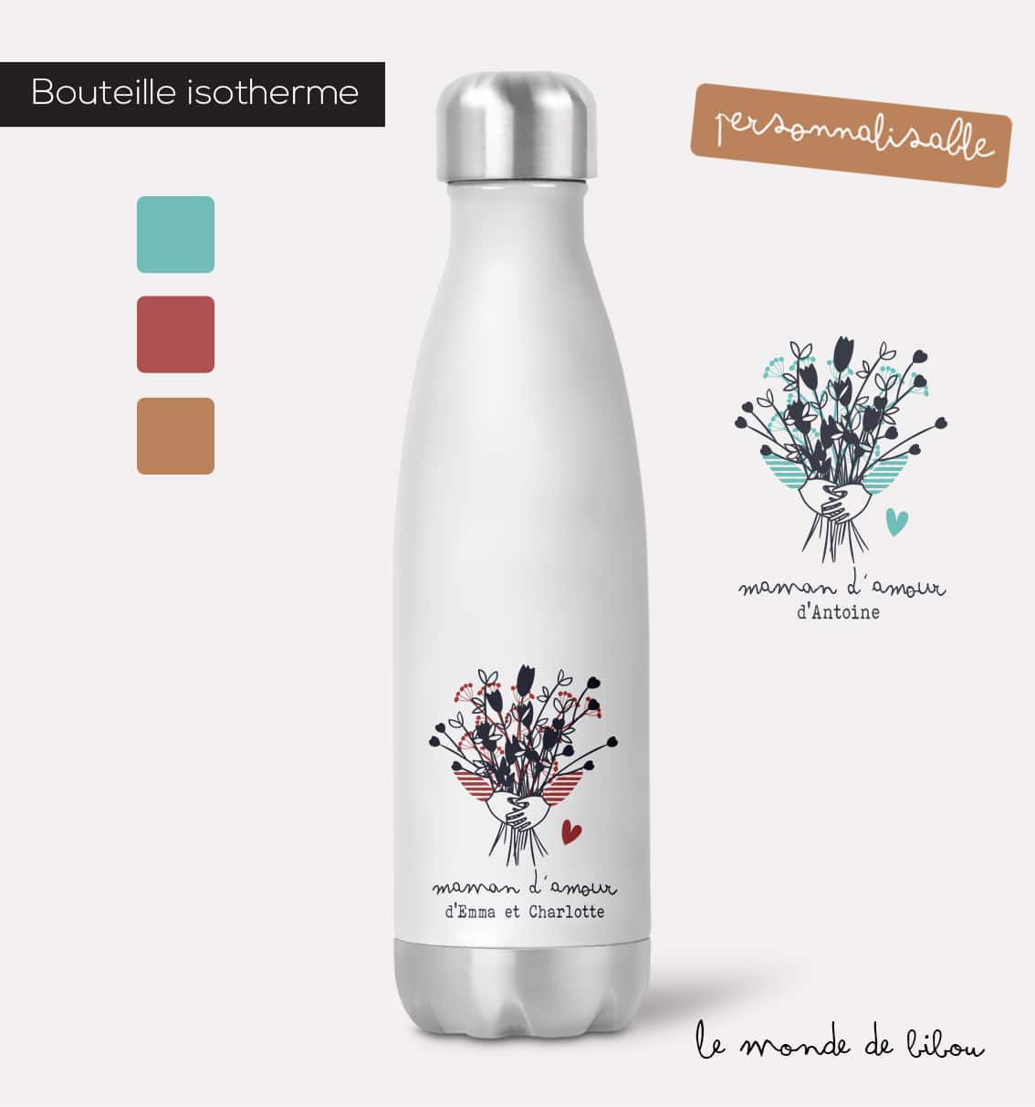 Vous souhaitez offrir un petit cadeau personnalisé à la maîtresse de votre enfant, ou encore remercier sa nounou ? Nous vous proposons ce Thermos Bouquet de fleurs Remerciement, une belle attention aussi jolie qu’utile pour remercier la personne qui a pris soin de votre enfant. Fini les bouteilles en plastique jetables, vraiment pas écologique, on pense gourde et bouteille isotherme maintenant. Un cadeau personnalisé à offrir en fin d’année scolaire ou pourquoi pas comme cadeau de Noël nounou personnalisé.