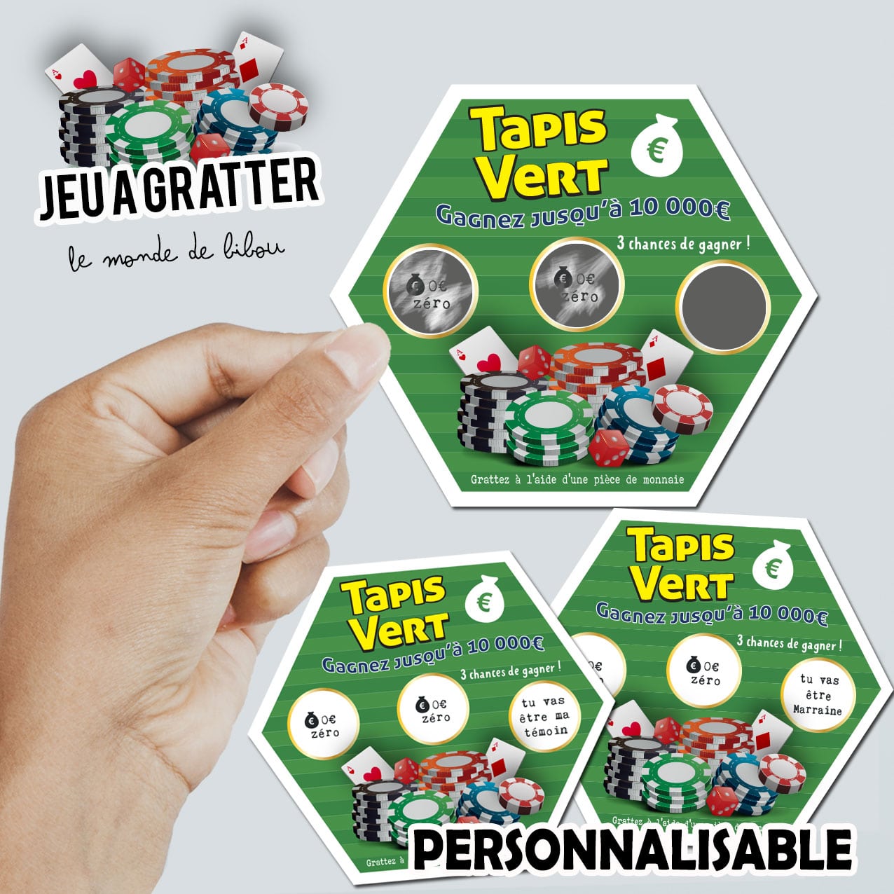 Un jeu à gratter Tapis vert, la chance sera forcément là avec cette carte à gratter originale, sous une des 3 pastilles c’est votre texte qui sera inscrit. Vous pouvez par exemple annoncer au futur parrain votre grossesse ou faire une jolie demande pour votre témoin de mariage… Faites vos plus belles demandes et annonces avec notre ticket jeu à gratter. Votre texte doit être une phrase courte !