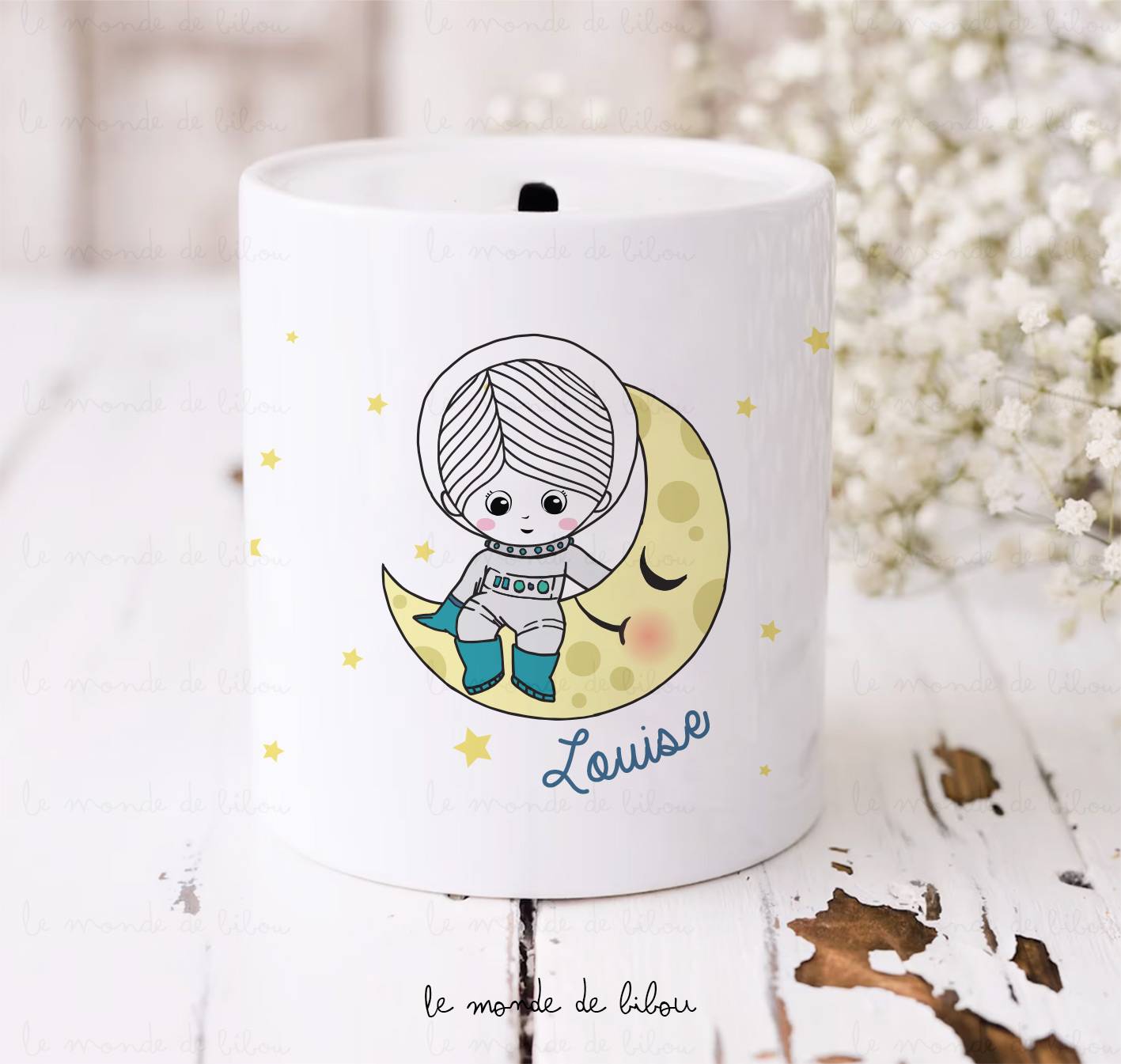 Vous cherchez un cadeau personnalisé pour enfant ? Ne cherchez plus, notre Tirelire personnalisée Cosmonaute est le cadeau idéal à offrir à l’occasion d’un anniversaire, des fêtes de Noël ou sans raison particulière, juste pour faire plaisir… L’illustration est unique, réalisée dans notre atelier !
