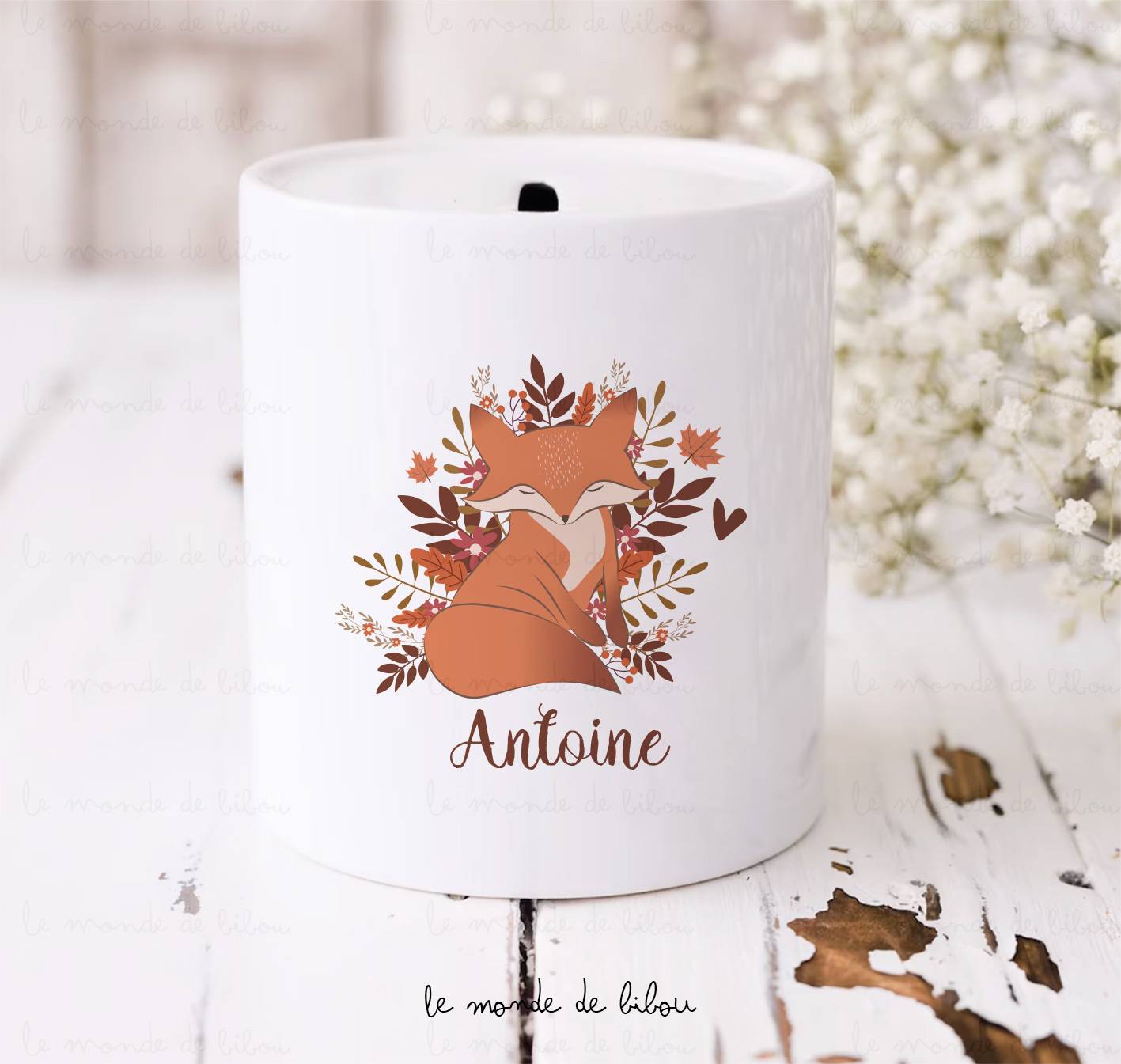 Vous cherchez un cadeau personnalisé pour enfant ? Ne cherchez plus, notre Tirelire personnalisée Renard est le cadeau idéal à offrir à l’occasion d’un anniversaire, des fêtes de Noël ou sans raison particulière, juste pour faire plaisir… La tirelire, joliment illustrée avec un petit renard, est personnalisable à son prénom. C’est un cadeau qui plaira à coup sûr aux petits économes en herbe ! Une illustration unique réalisée dans notre atelier !