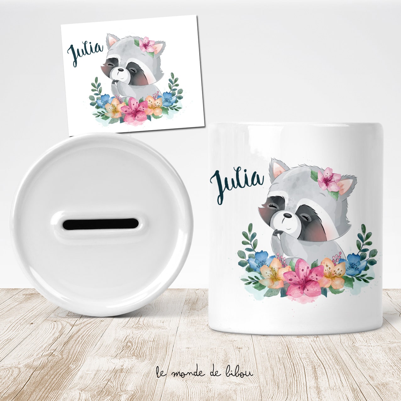 Vous cherchez un cadeau personnalisé pour enfant ? Ne cherchez plus, notre Tirelire personnalisée Raton laveur est le cadeau idéal à offrir à l’occasion d’un anniversaire, des fêtes de Noël ou sans raison particulière, juste pour faire plaisir… La tirelire, joliment illustrée avec un mignon petit raton laveur et une couronne de fleurs, est personnalisable à son prénom. C’est un cadeau qui plaira à coup sûr aux petits économes en herbe !