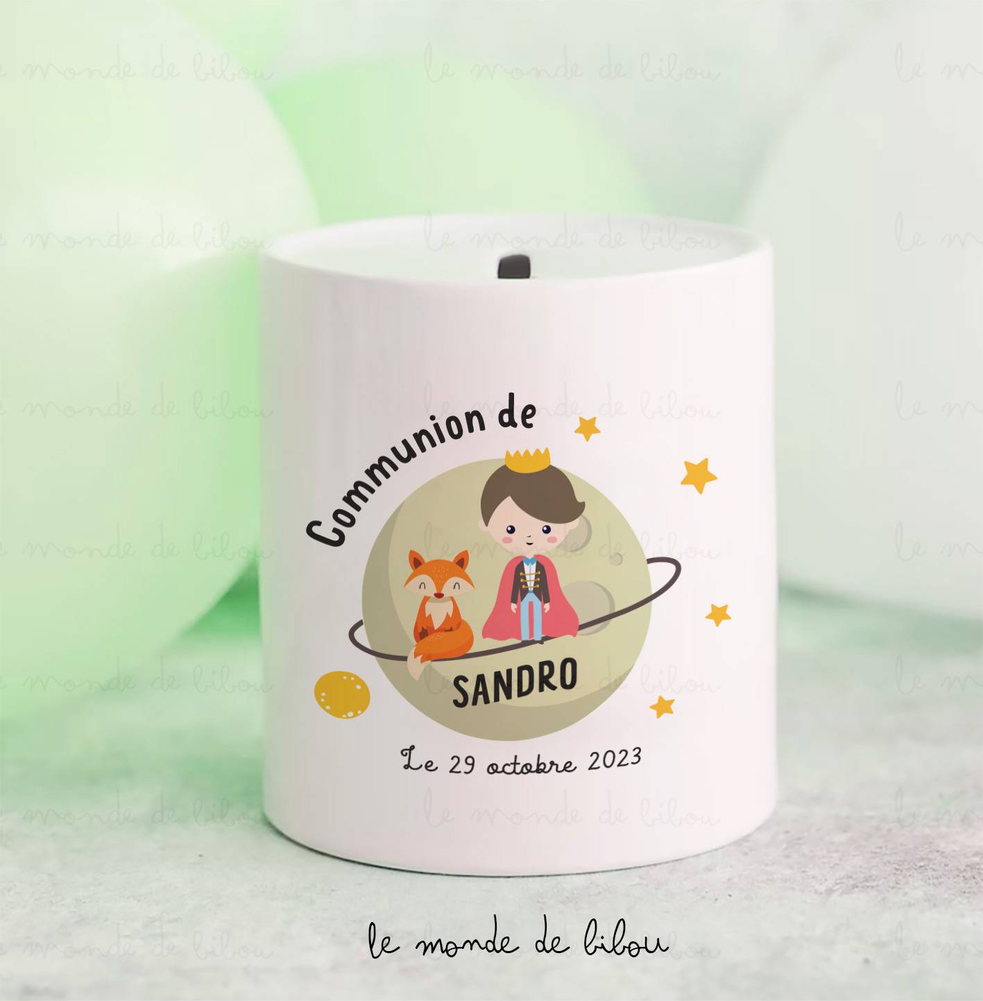 Vous cherchez un cadeau souvenir personnalisé pour le Baptême ou l’anniversaire de votre enfant ? Ne cherchez plus, notre Tirelire souvenir Petit prince est le cadeau idéal à offrir à l’occasion de votre évènement heureux. La tirelire est personnalisable à votre évènement et au prénom de l’enfant. C’est un cadeau souvenir unique aussi joli qu’utile ! C’est une belle idée pour que les grands-parents puissent gâter leurs petits-enfants ou même que les parrains et les marraines chouchoutent leurs filleuls… Une illustration unique réalisée dans notre atelier !