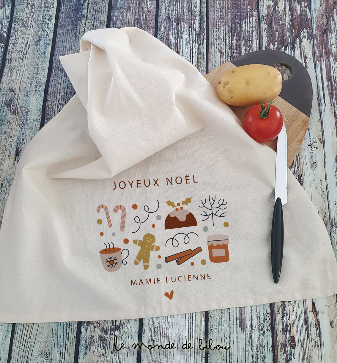 Voici un Torchon de cuisine Biscuits de Noël personnalisé idéal pour celle ou celui qui a fait de la cuisine son univers. A partir de maintenant c’est une histoire de famille ! Un indispensable du quotidien qui permettra à la personne qui le recevra de penser à vous avec tendresse. Grâce à ce torchon personnalisé vous savez quoi offrir pour Noël !