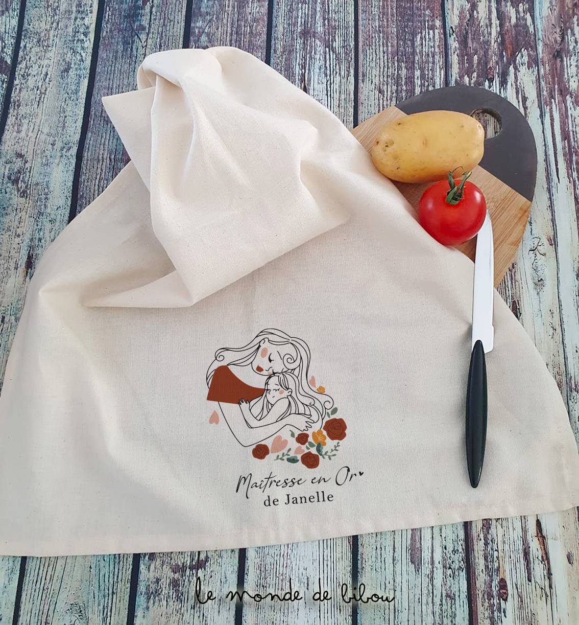 Voici un joli cadeau à offrir à l’enseignante de votre enfant, on adore ce Torchon de cuisine Maîtresse en or personnalisé ! C’est le cadeau maîtresse personnalisé utile idéal à offrir à l’occasion d’un anniversaire, comme cadeau de Noël ou juste comme ça pour faire plaisir à cette personne qui compte pour votre enfant… C’est un cadeau personnalisé parfait à l’occasion de son anniversaire ou pour la fin de d’année scolaire.