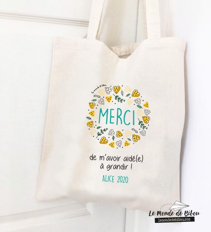 Vous souhaitez offrir un petit cadeau aussi joli qu’utile ? Nous vous proposons ce joli Tote bag cadeau Merci personnalisé au prénom de votre ou vos enfant(s). On adore ce petit sac tote bag multi-usage, il servira aussi bien pour faire les courses, aller à la salle de gym, que pour amener ses petites affaires au travail… On l’adore ce joli cadeau pour la nounou, l’atsem ou la maîtresse de votre enfant ! Idéal à l’occasion d’un anniversaire, comme cadeau de Noël ou comme cadeau de fin d’année scolaire… Ce sac personnalisable merci de m’avoir aidé à grandir ne pourra que faire plaisir à la personne qui va la recevoir.
