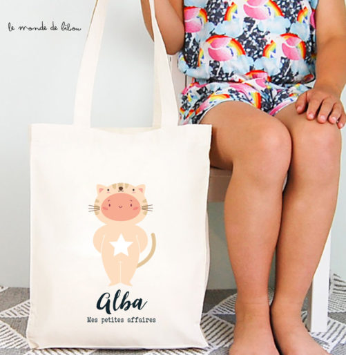Un petit Tote bag enfant Mon petit chat personnalisé multi-usage qui servira pour la crêche, l’école maternelle, pour transporter ses affaires chez les copains ou encore pour partir en week-end chez papy et mamie… Tout est possible ! Le Sac tote bag mon petit chat est personnalisé au prénom de votre enfant. Les couleurs douces et discrètes, ainsi que son dessin mignon, plairont à coup sûr à l’enfant qui recevra ce petit sac.