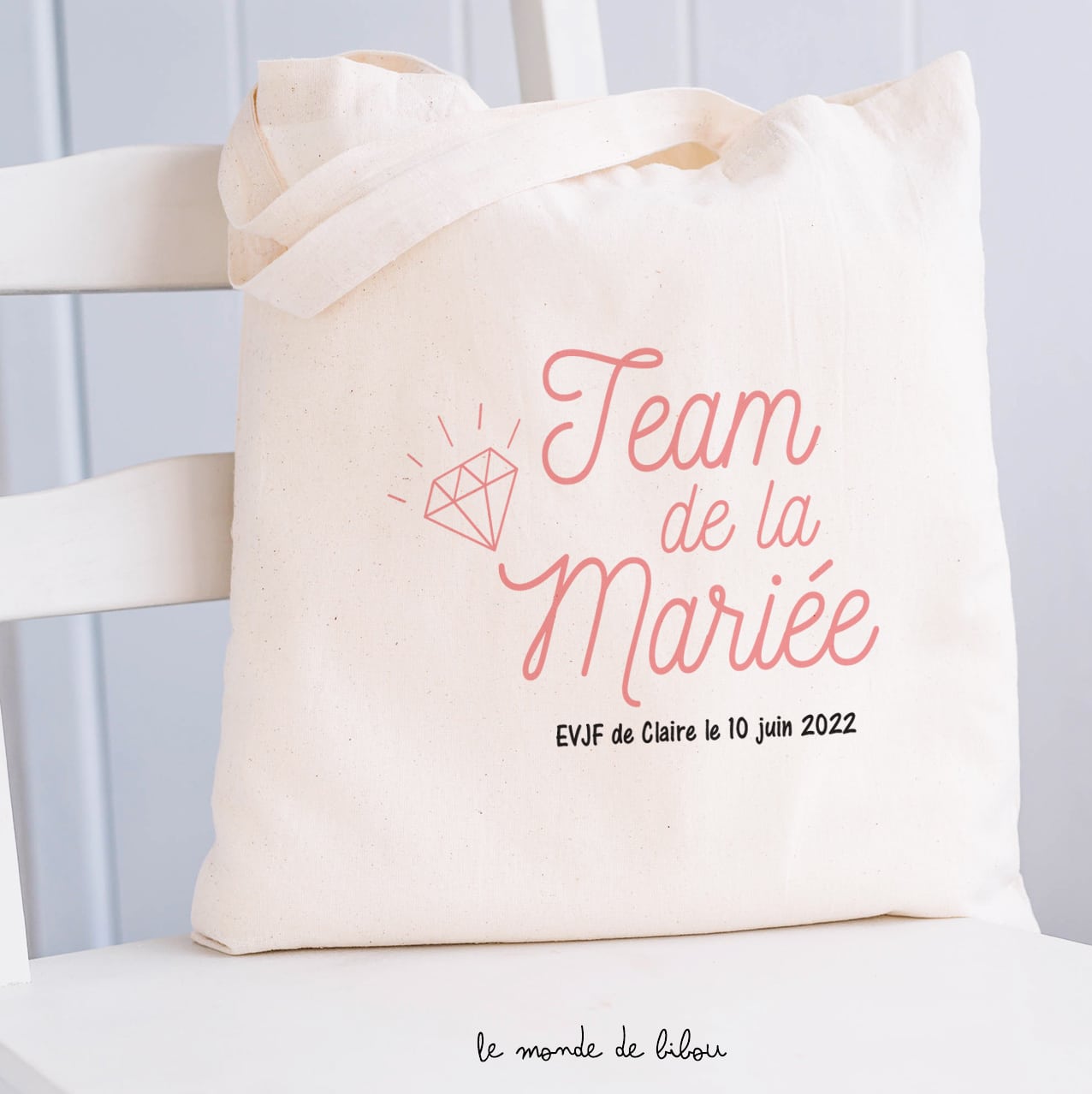 Vous cherchez une idée originale pour personnaliser l’Enterrement de Vie de Jeune Fille de votre amie ? Nous vous proposons ce sac tote bag imprimé et personnalisé pour votre événement. Le Tote bag EVJF diamant vous suivra tout au long de cet événement et il restera un joli souvenir pour la future mariée comme pour sa team. Vous pouvez être sûr de faire plaisir à celles qui le recevront !
