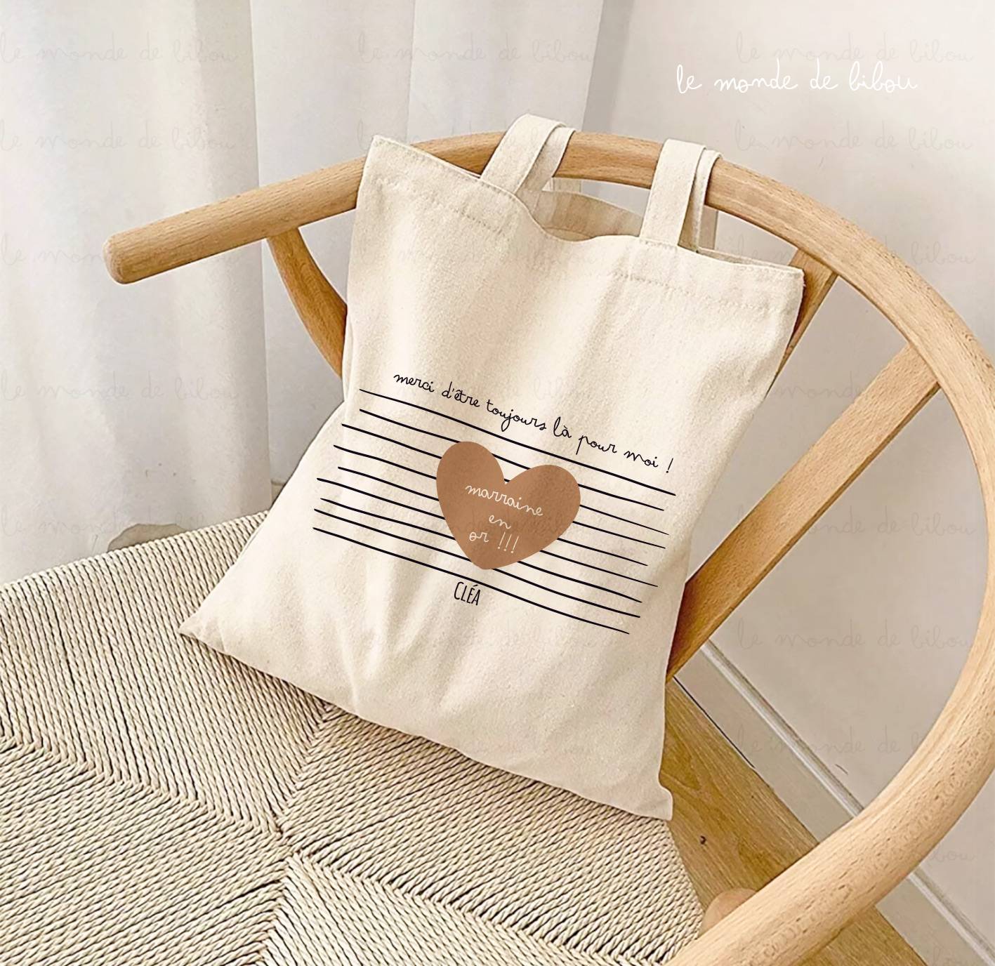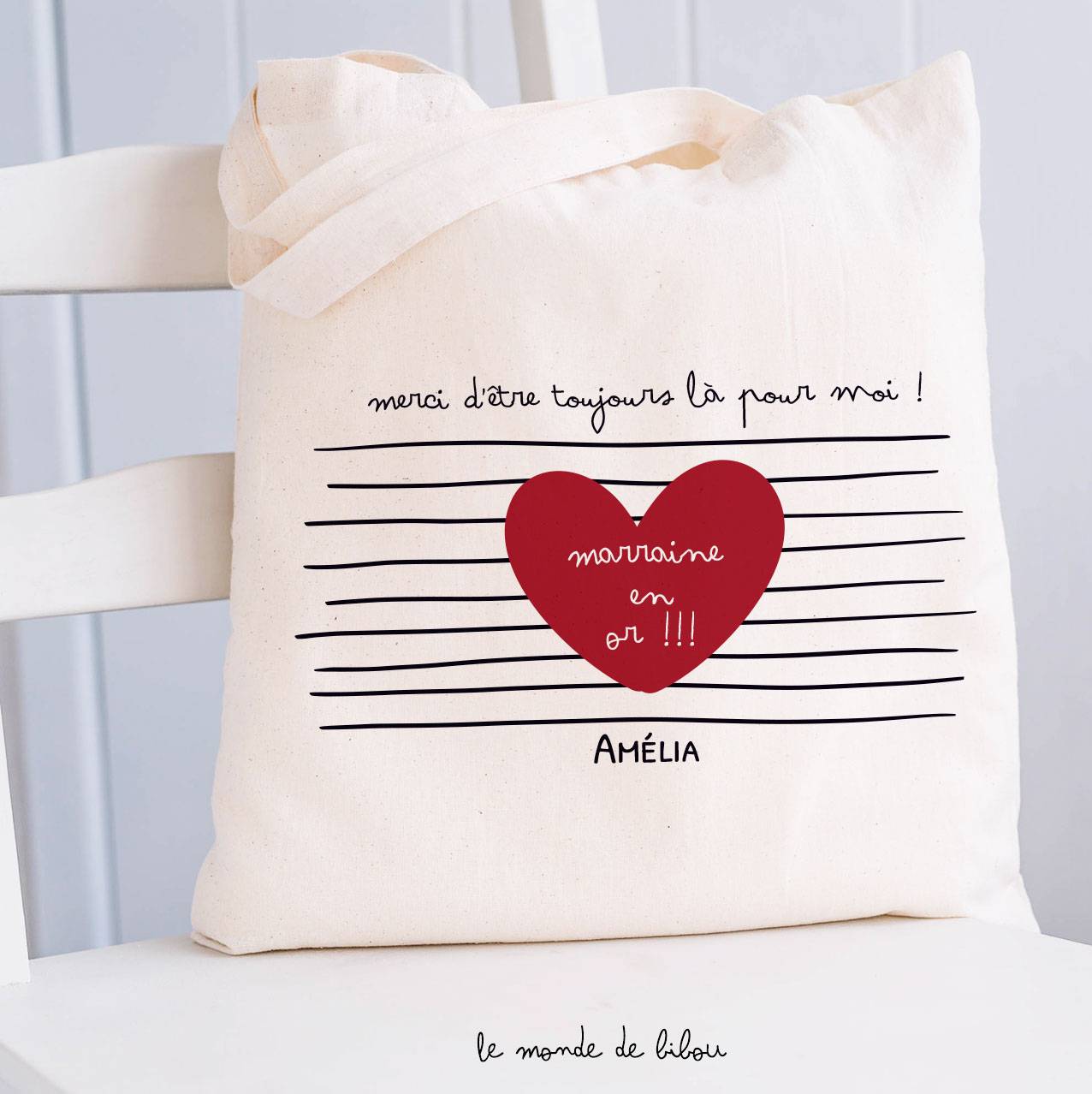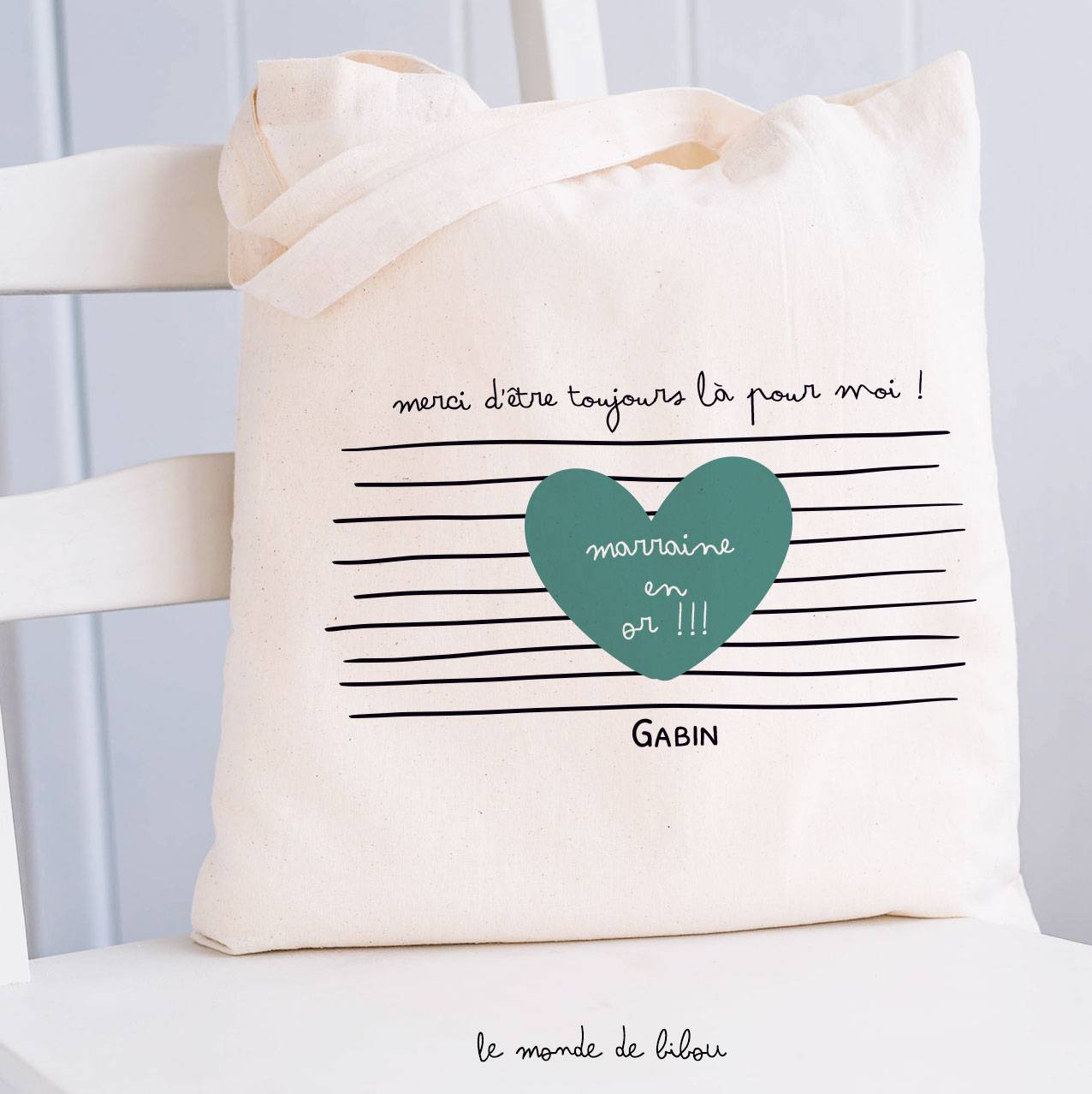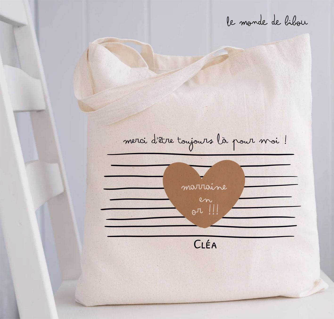 On adore ce super tote bag pour une Super Marraine, un cadeau marraine personnalisable au prénom de son ou sa filleule.