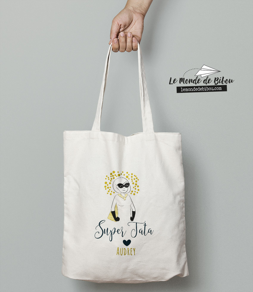 Ce Tote Bag Tata Super Héros est une chouette idée de cadeau à offrir à une super Tata, personnalisé à son prénom. Une belle idée de cadeau pour dire à sa Tatie chérie combien on l’aime, combien on pense à elle et comme on tient à elle. Idéal pour célébrer un anniversaire, une naissance ou comme cadeau de Noël….