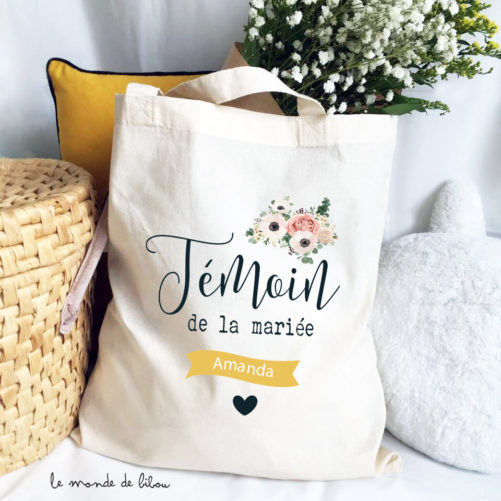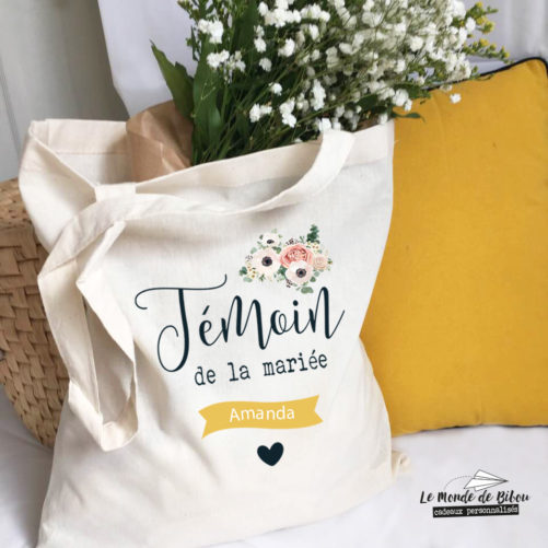Vous cherchez une idée originale pour remercier votre (ou vos) témoin(s) de mariage ? Nous vous proposons ce Tote bag Témoin de la mariée personnalisé pour votre événement. Ce sac cadeau témoin vous suivra tout au long de votre journée spéciale (sac mariage ou tote bag evjf) et il restera un beau souvenir, aussi joli qu’utile.
