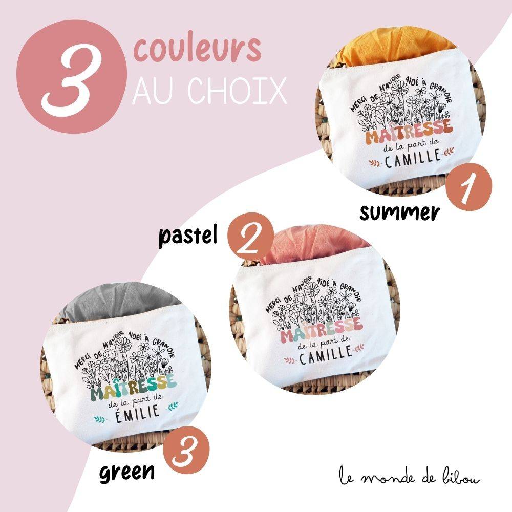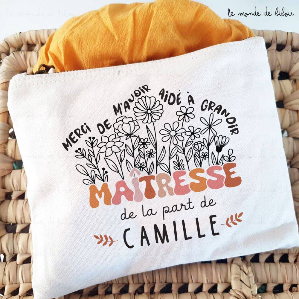Une jolie Trousse personnalisée cadeau maîtresse prénom à offrir à l’enseignant(e) de votre enfant. Un chouette cadeau pour remercier la maîtresse ou le maître de votre enfant ! L’attention idéale, aussi jolie qu’utile, à offrir la fin de l’année, pour les vacances ou encore pour toutes autres occasions. La pochette est personnalisable au prénom de l’enseignant(e).