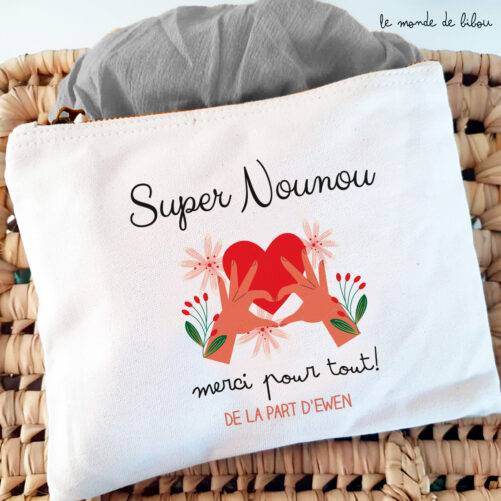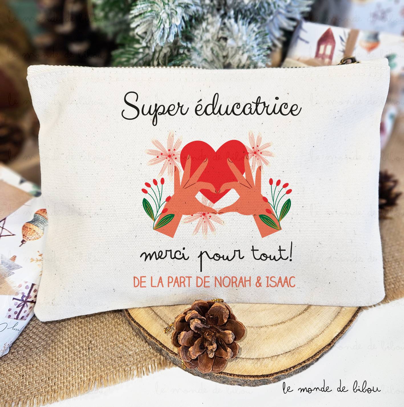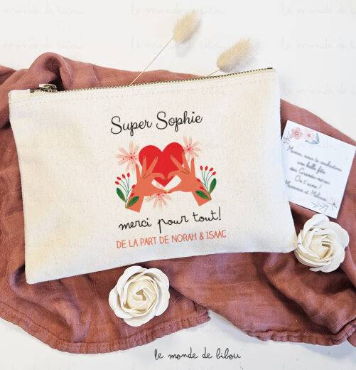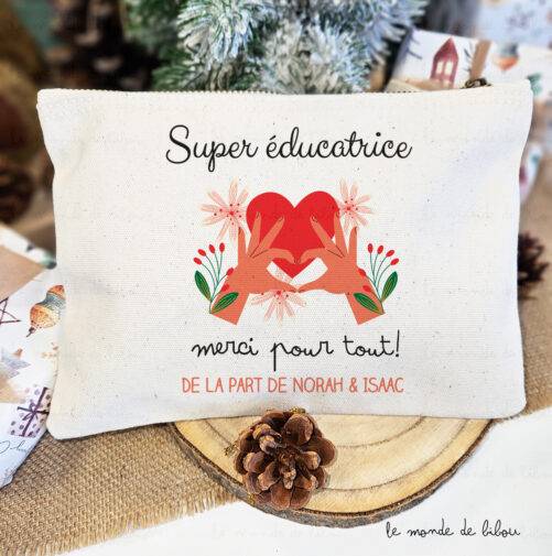 Cette pochette est une chouette idée de cadeau à offrir à une super maîtresse, une nounou, une animatrice ou encore une ATSEM… A qui vous voulez ! C’est une belle attention pour remercier toutes les personnes qui s’occupent de votre enfant au quotidien. Elles méritent donc toutes un petit cadeau, une petite attention qui fera forcément plaisir à recevoir comme notre trousse personnalisable.